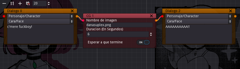 Speaking of which, content can now be created with the story editor. It looks ugly and lacks nodes for other game elements like music but we can now start to port all of the content that was already made in the other engine. The porting process was pretty quick, now to continue grinding nodes.